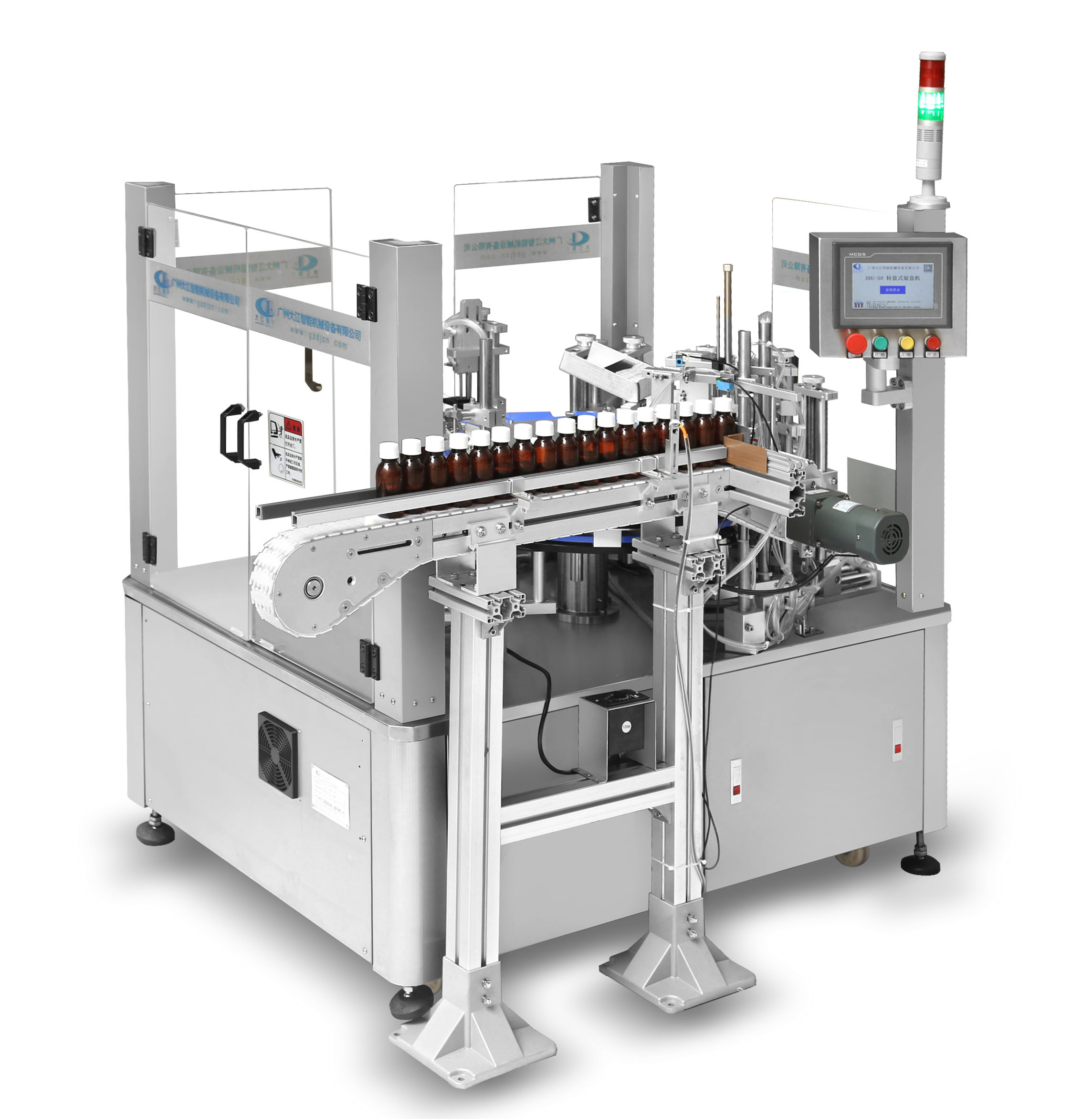 DDU-1603 立式圓瓶定位貼標(biāo)機(jī) 適用范圍:用途廣泛!主要適用于醫(yī)藥、日化、食品等行業(yè)的圓柱形包裝容器或小錐度的圓錐形包裝容器的單標(biāo)、雙標(biāo)自動(dòng)定位貼標(biāo).該機(jī)拓展性強(qiáng)!可選配各類打印機(jī)完成在線實(shí)時(shí)打印,可單機(jī)使用,亦能連接生產(chǎn)線使用 主要性能結(jié)構(gòu)特點(diǎn):1、中英文觸…
